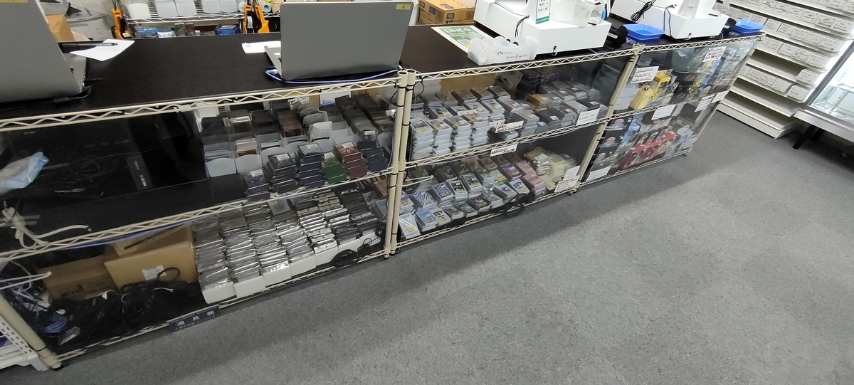 壁に沿ってたくさんのストレージが置いてあり、高額カードはディスプレイに飾ってありました。