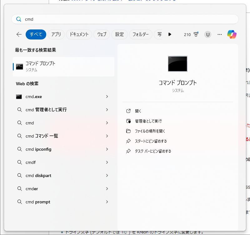 書き換えファイルの実行exeファイルは直接クリックしてもダメなので、コマンドプロンプトで実行します。ウィンドウズボタンを押して上の検索窓に「cmd」といれるとコマンドプロンプトが表示されます。